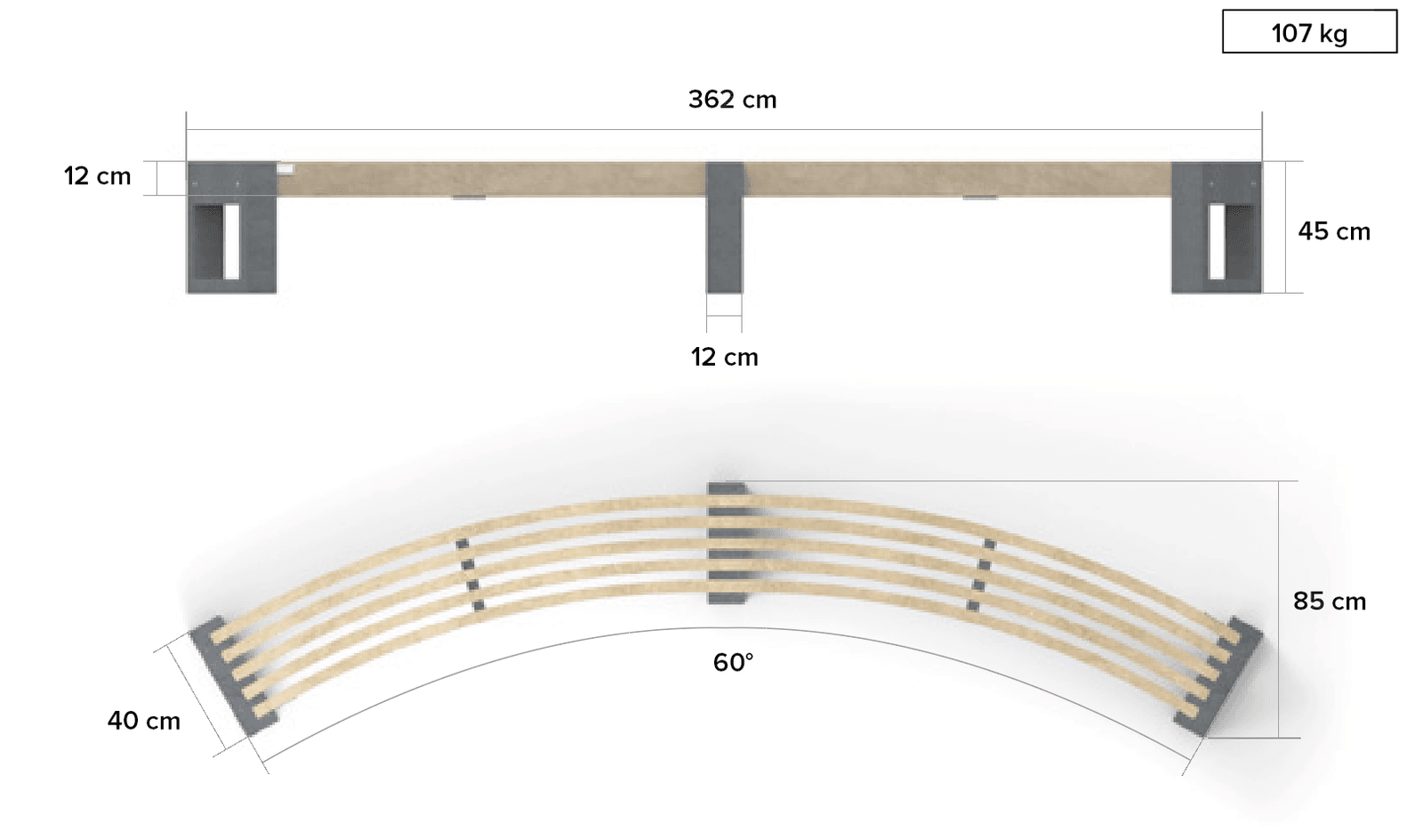 De planken vormen een kromming waardoor de buitenste bankvoeten onder een hoek van 60° tegenover elkaar op het grondvlak staan.